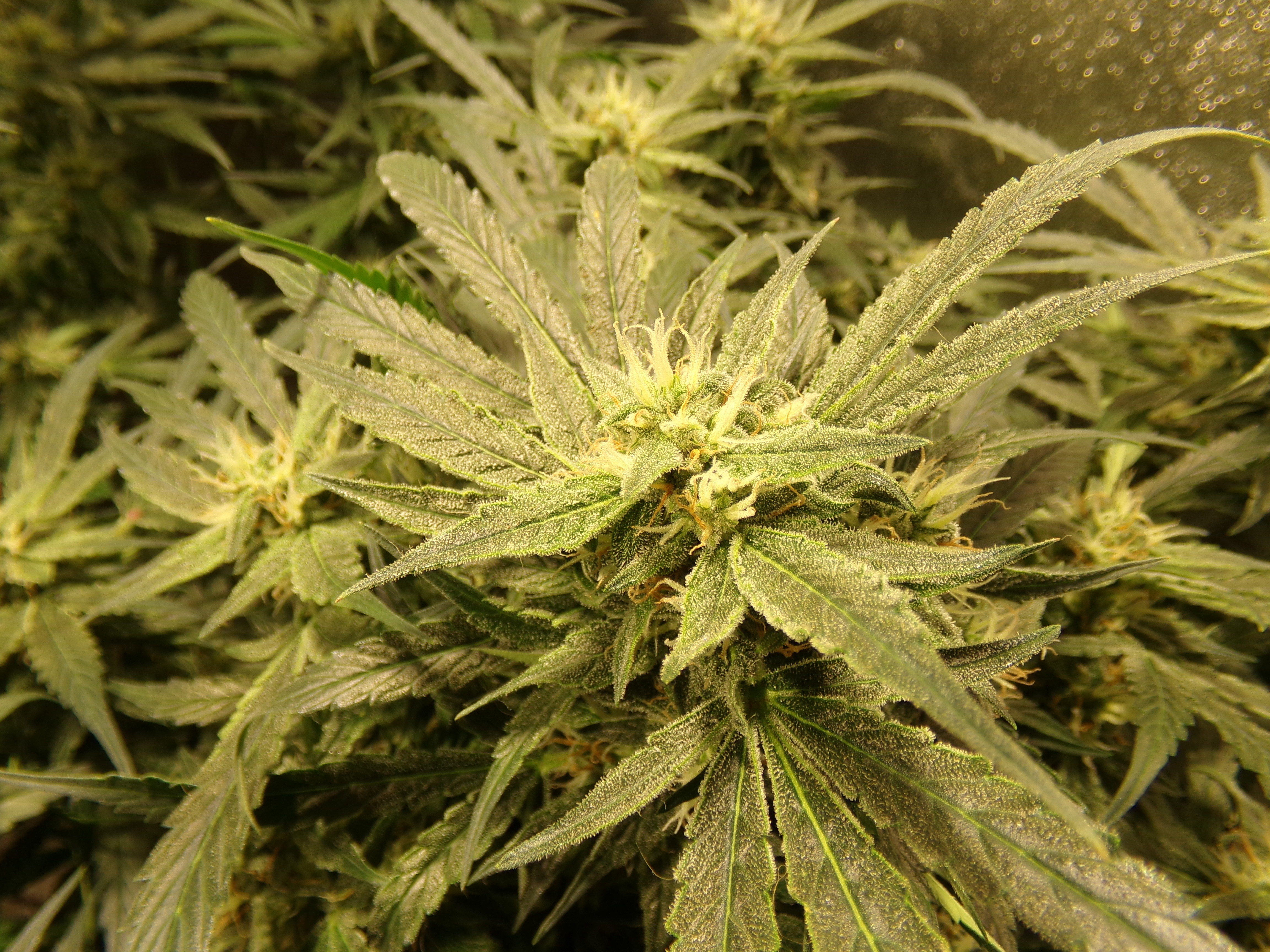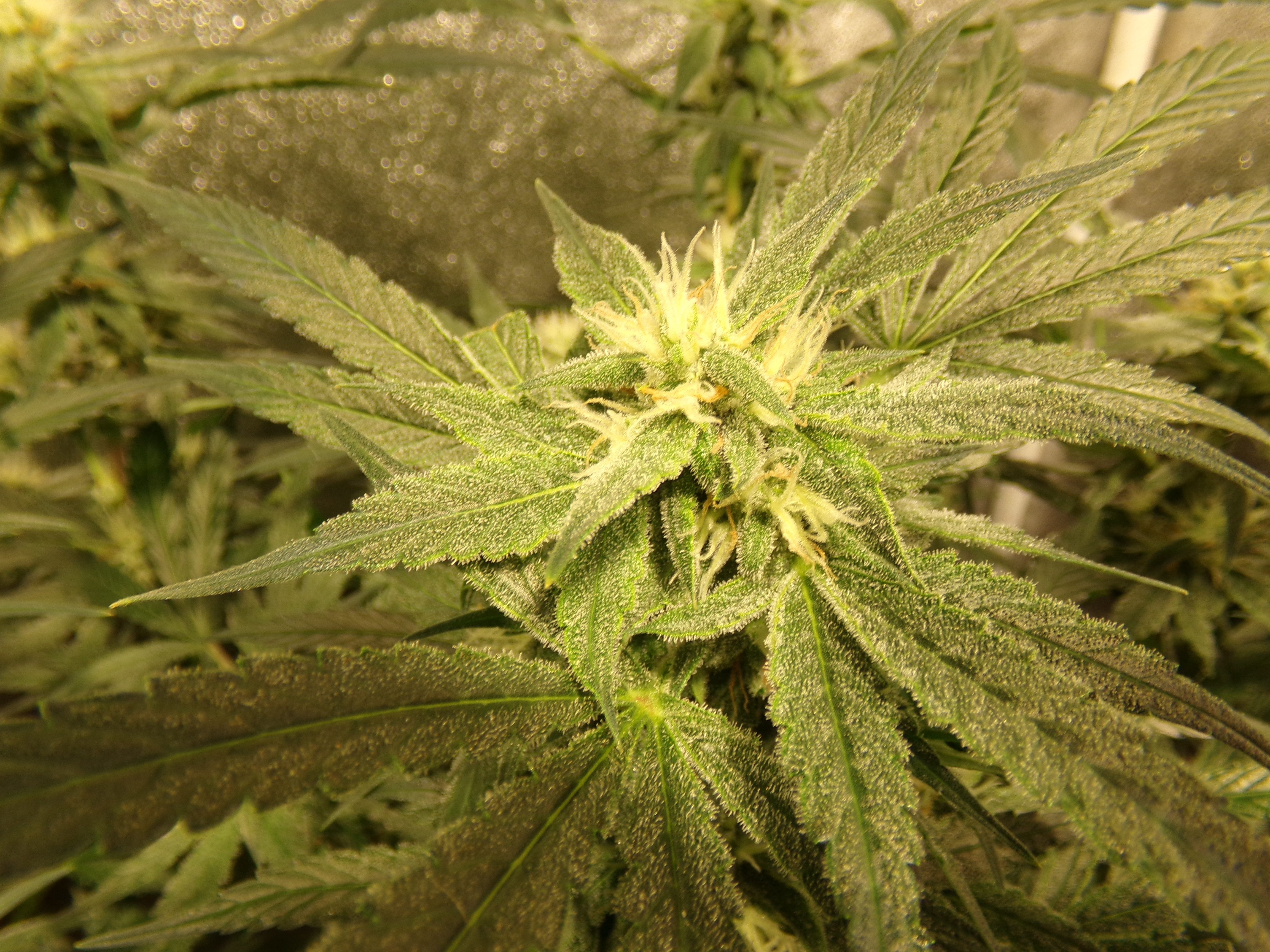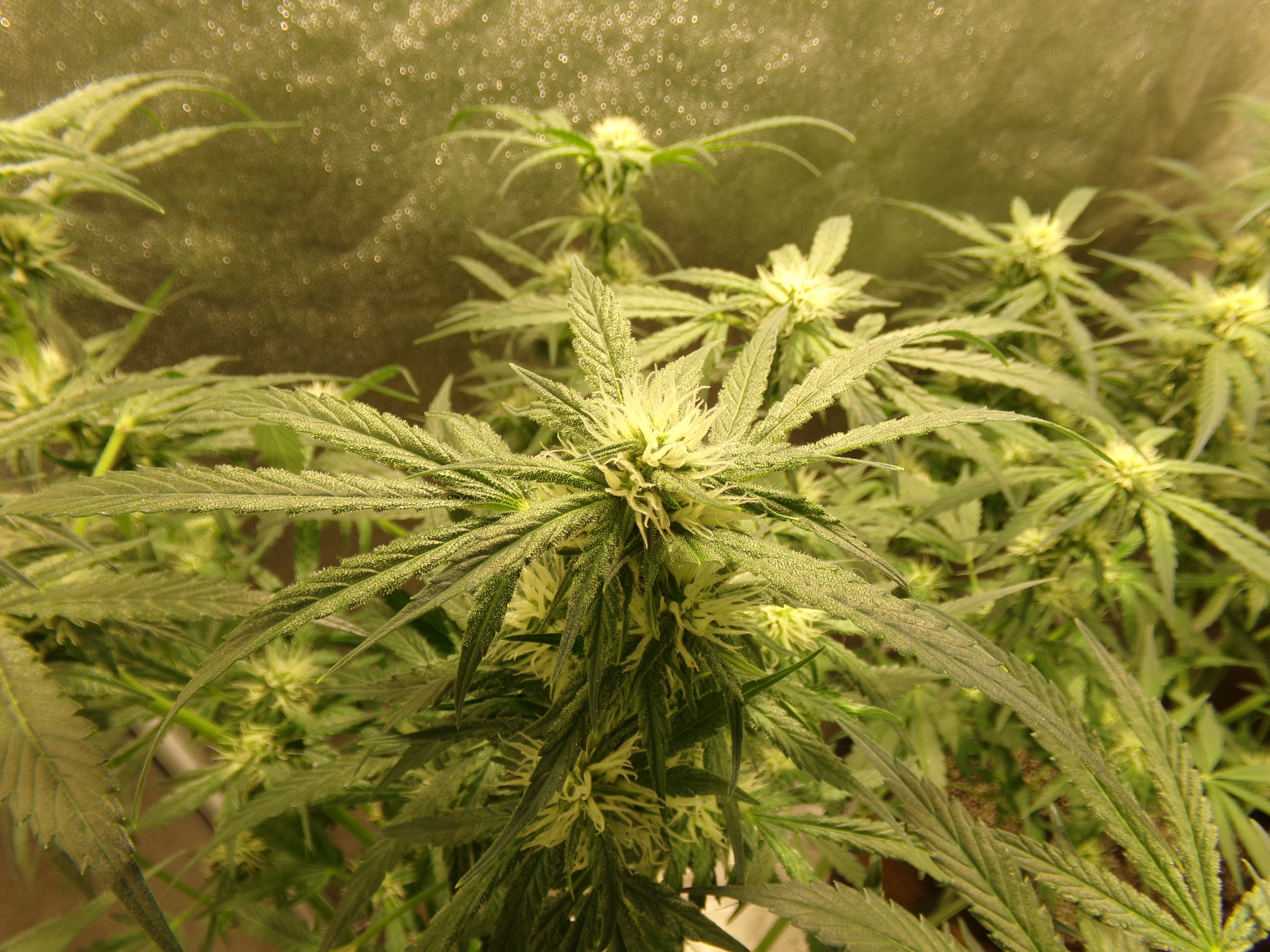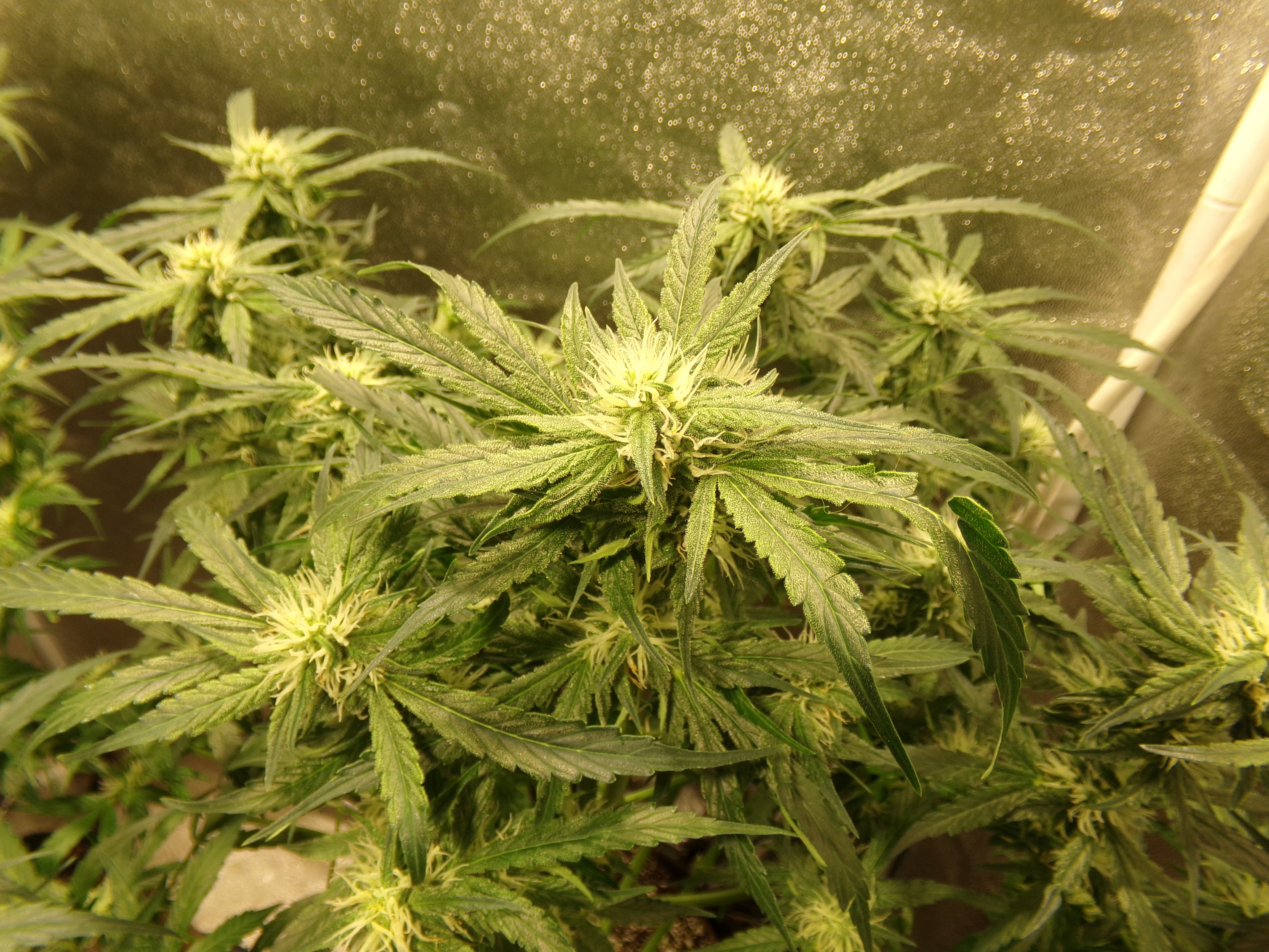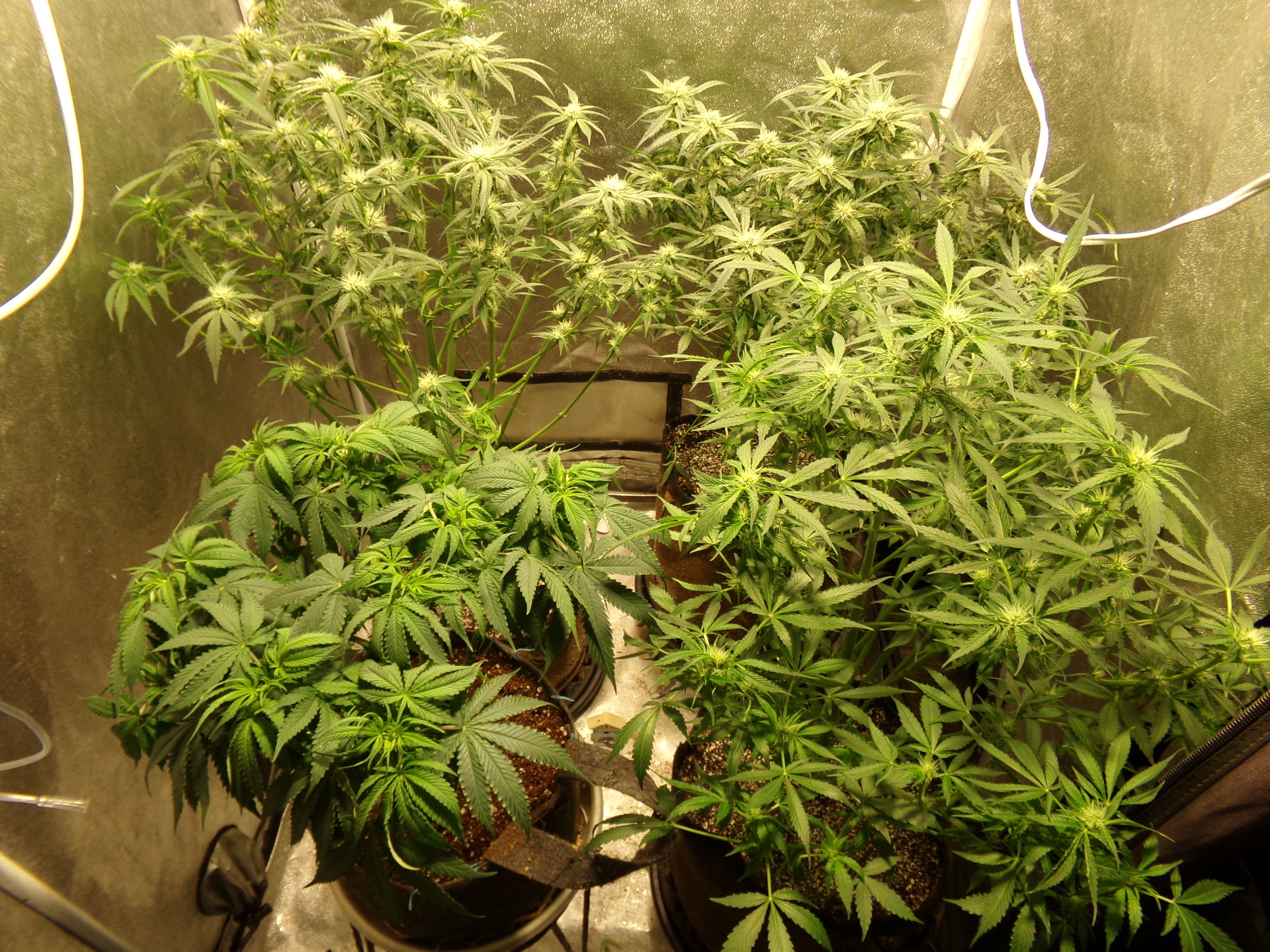 Heavy defoliation. What is left on the two back plants is covered in trichomes. Front right is struggling. Only in the past week has it put out any effort. Front left lost position in the tent for lack of effort and new leaf green colored leaves throughout the grow. It's a big, bushy plant, but not really interested in womanhood. Pictures 2 and 3.