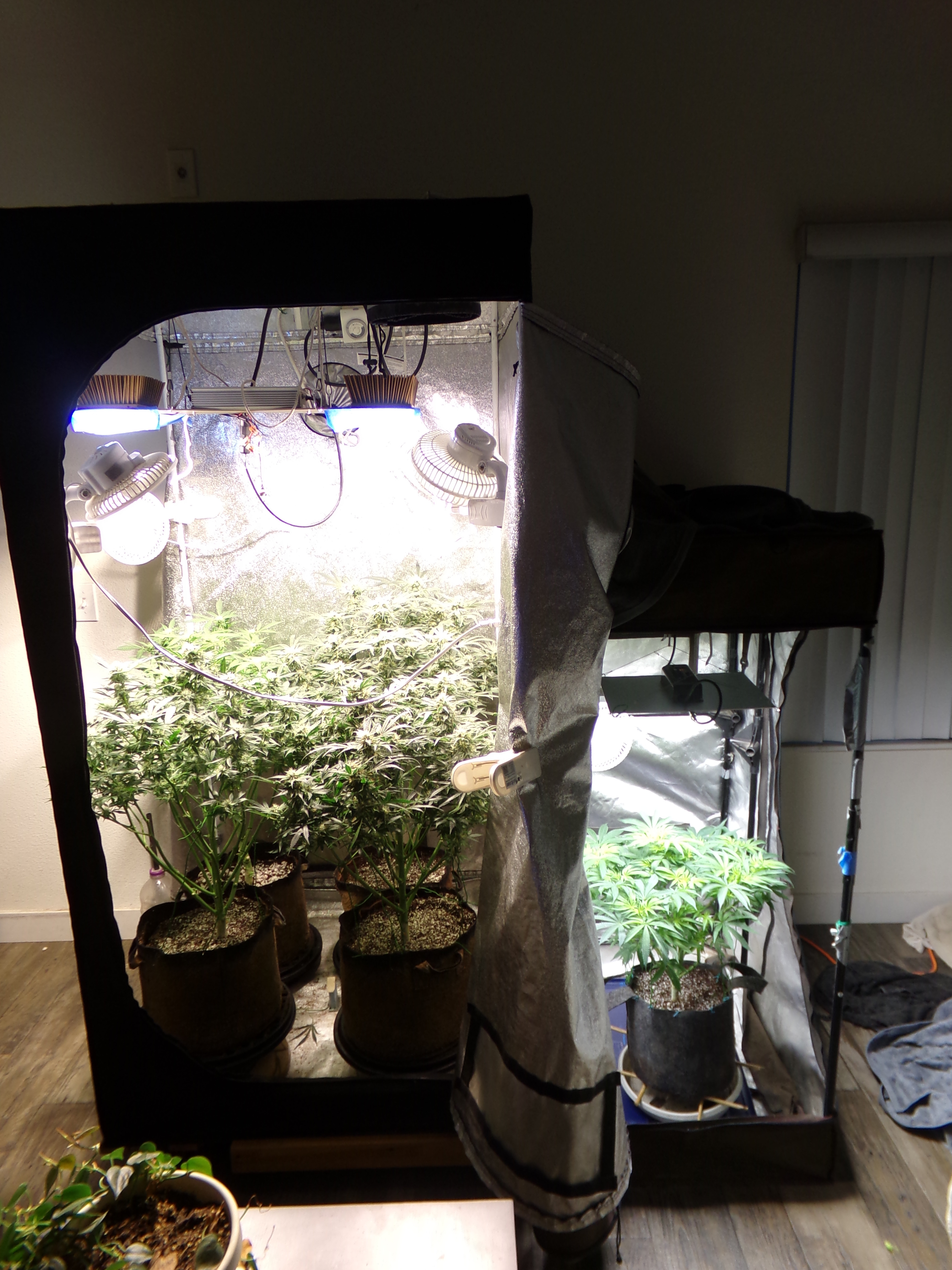 The 2x3 came out of the closet. Got a set of new fans. And a new light. Not 'new' as in 'new'. Rather, a thrice used HLG 100 that was gifted by... by... damn! I'm holding onto anonymity by request. I was supposed to come up with a cool story about how this light came to me, but I can't. Simply, one of you good generous people hooked me up. A damned fine gesture!