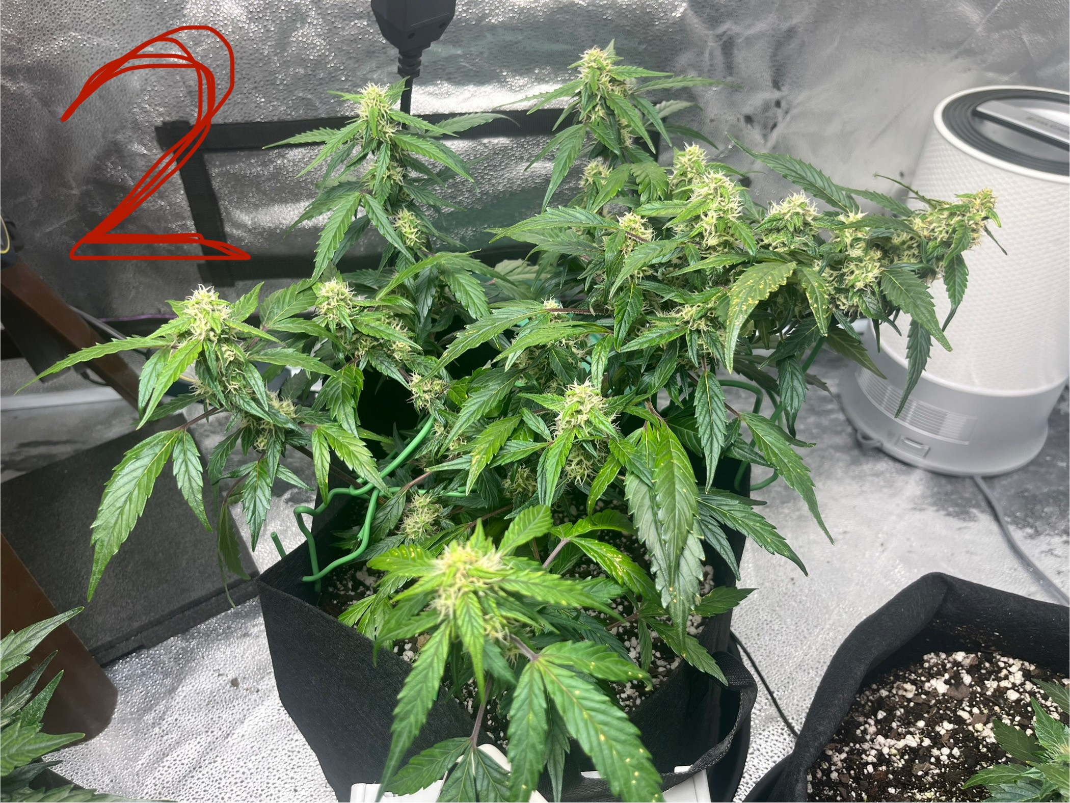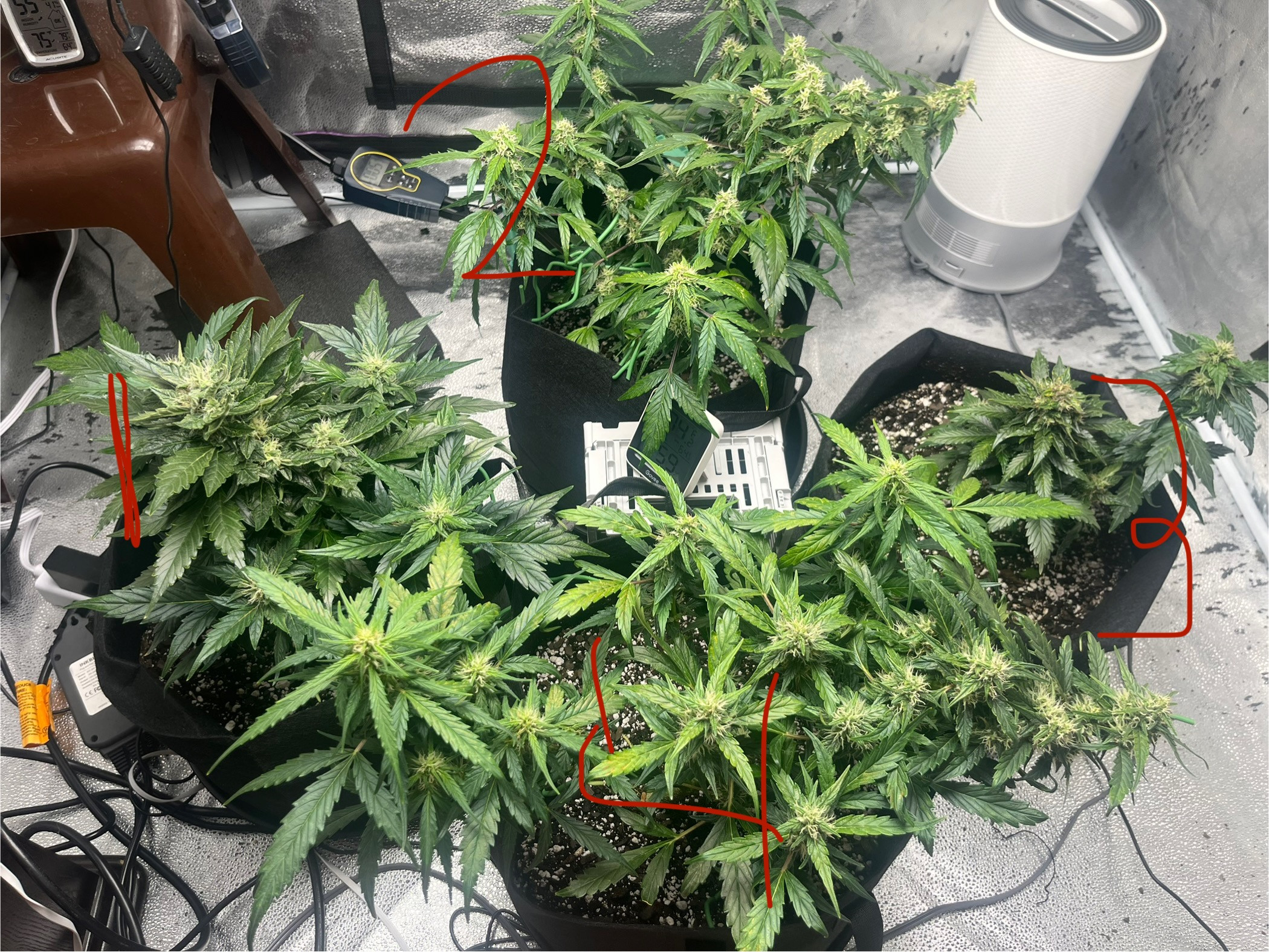 Im growing grandaddy purple auto flowers and I’m on day 55. They all started flowering on like week 3 so I’m guessing maybe I’m starting to wind down. They all seem to have different deficiency(or toxicity) indicators going so I’m looking for some help. I’ve included pictures of the oldest bud, newest bud, and pictures of stress signs the plant has. The second plant also has dark purple stems while the other ones don’t really. On the third plant I’m wondering if the buds on the top are damaged/burnt or if the buds just gradually turn darker like that(it is grandaddy purple after all and this one started flowering earlier than the rest). Also curious if I should start flushing or anything at this point or continue with the bloom nutrients. Thanks in advance! Any questions please ask.