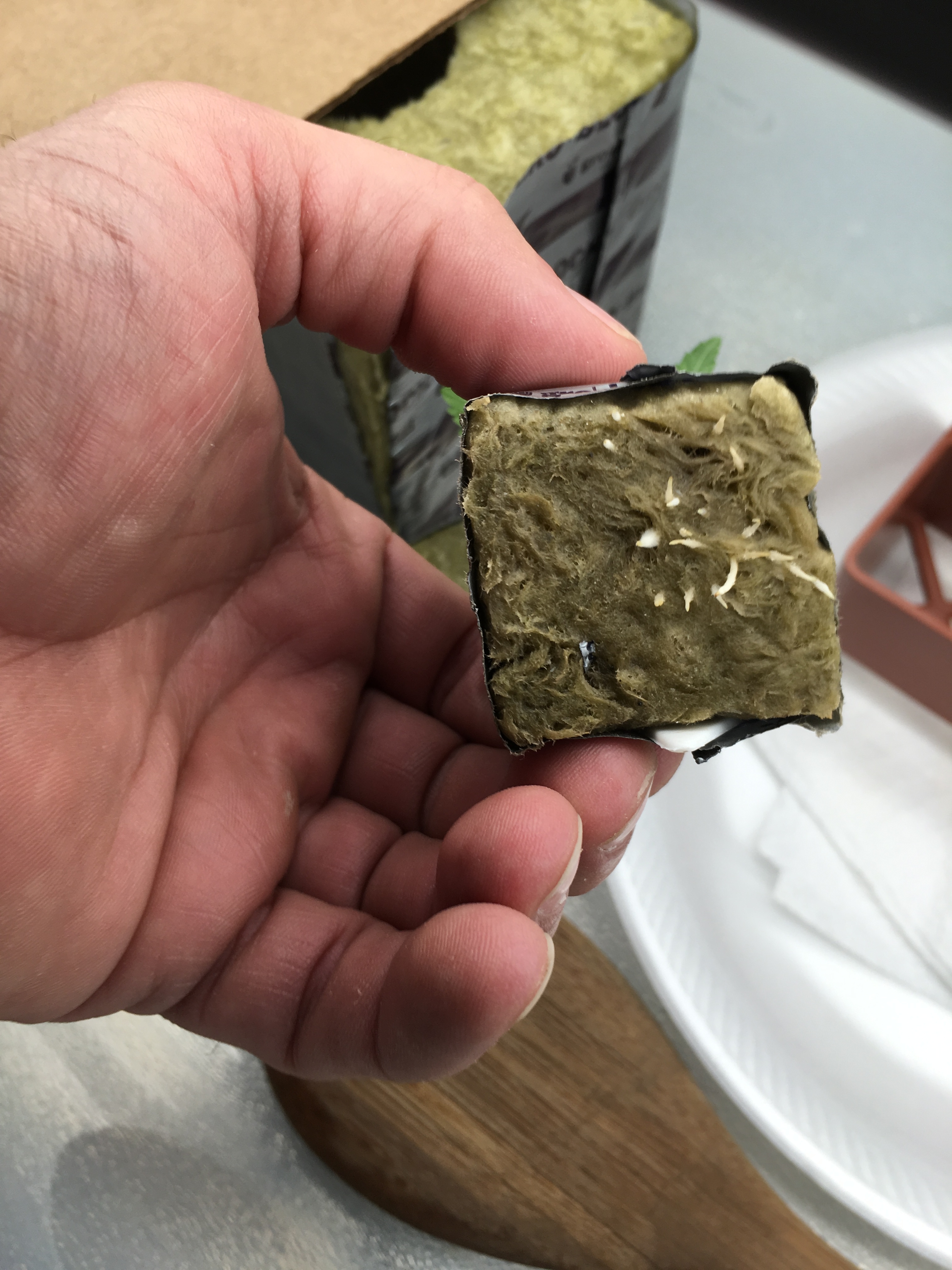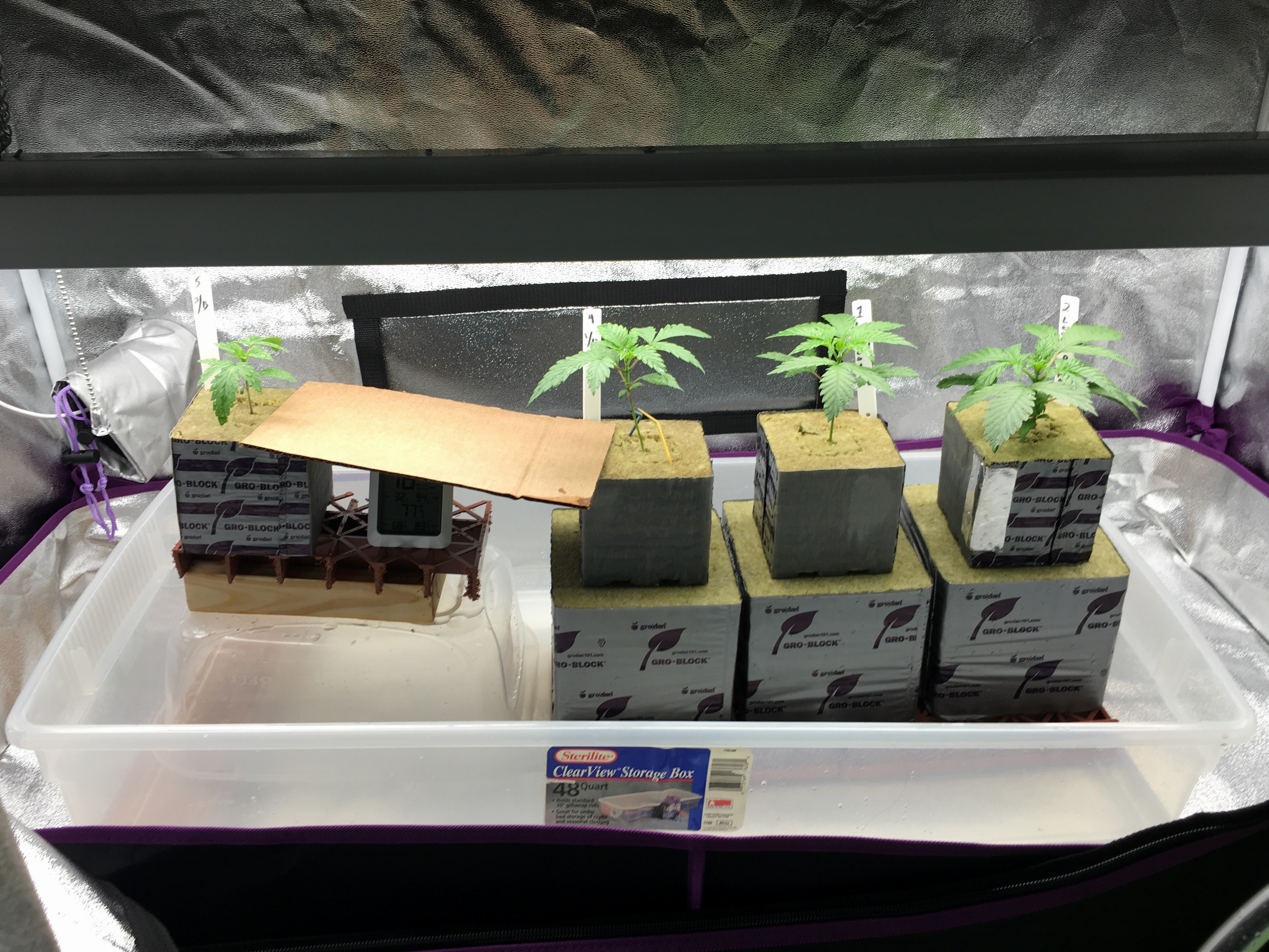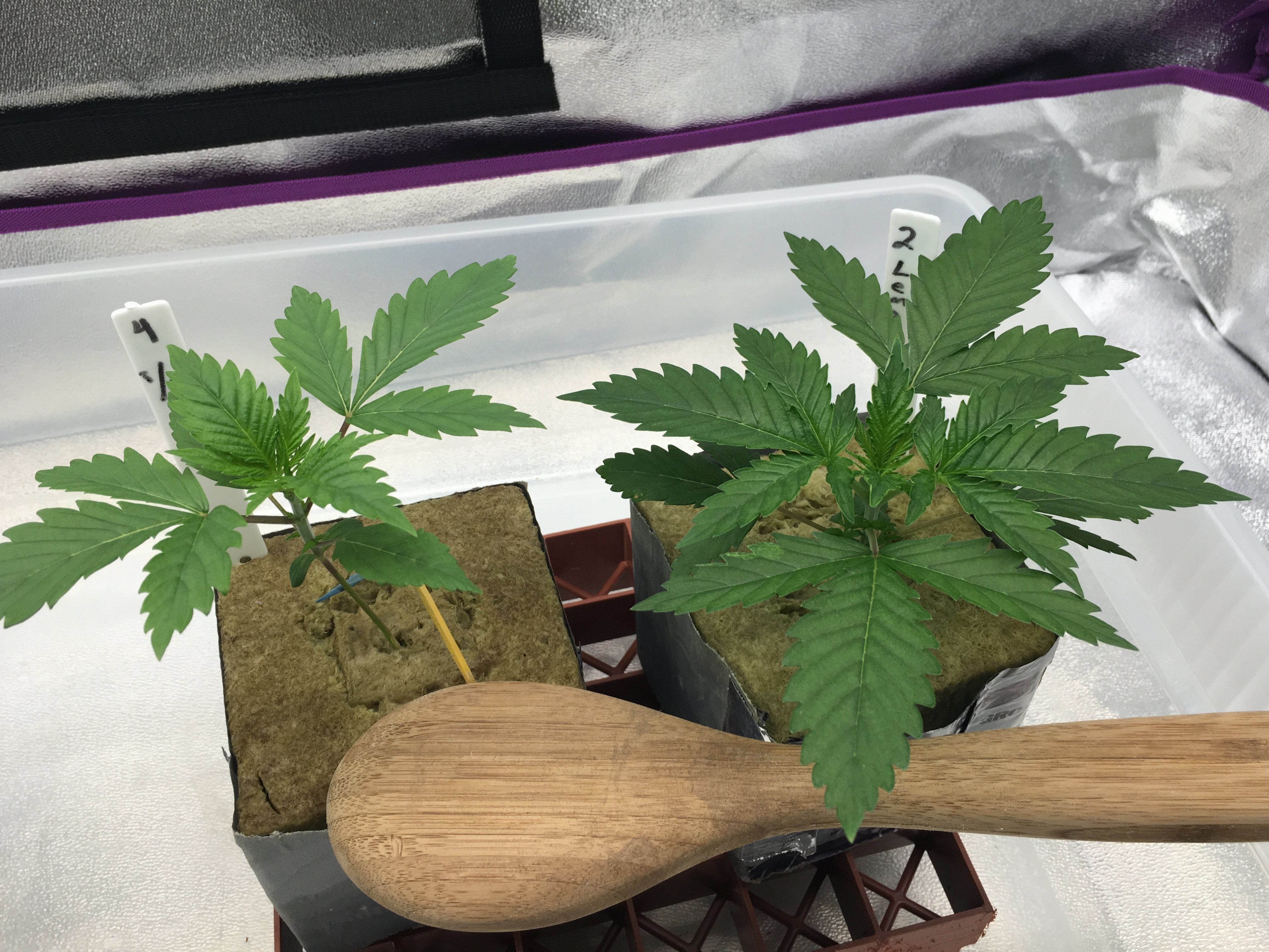 Hey friends, first timer here. Have been reading and watching videos for the last 3 months. Wanted to help out my ex and my daughter with their medical issues. One has depression the other anxiety and sleep issues. Since we're in Texas we will probably be the last state to go legal (too many conservatives...lol). Anyway I ordered some Lemon OG Haze to start. I have a 4 by 2 Tent for germinating, seedlings and veg cycle. I'll be using 4 by 2 tray setup for flowering using the ebb & flo system. i decided on Blue Planet nutrients just because. Germinated 5 seeds, 4 popped. Placed in 1" rockwool cubes until the roots popped out the bottom. Then transferred over to 4" blocks for the last week (1st week of veg cycle). i used half the recommended nutrient solution and quite frankly they look great. Dark green, bushy and about 4 to 4 1/2" tall. Yesterday noticed that the roots are already popping out the bottom of the 4" block. So I soaked my 6' block overnight in 5.6 ph water. Today I placed the 4" blocks on top of the 6" and then soaked 'em down with the full nutrient chart recommendations. This is where they stay (4 by 2 tent under a 4' light using LED instead of florescent lights) until they are ready to be moved to the 4 by 2 tray filled with clay pellets under a 600 watt HPS/MH. Was hoping and would greatly appreciate any comments, critiques or advice. On a side note my little girls are already putting out a strong lovely smell. Anyway thanks for reading this and I look forward to you feedback.