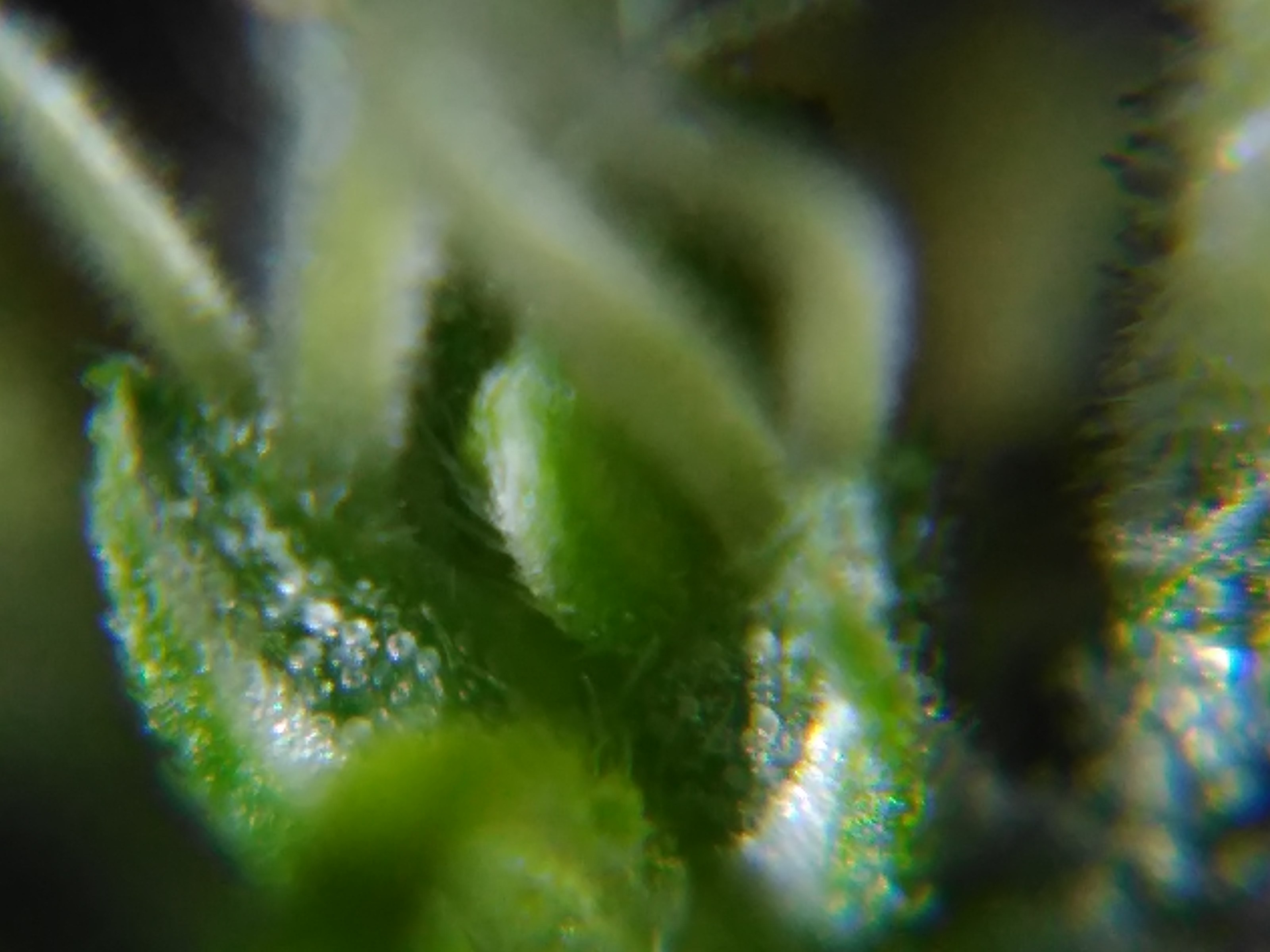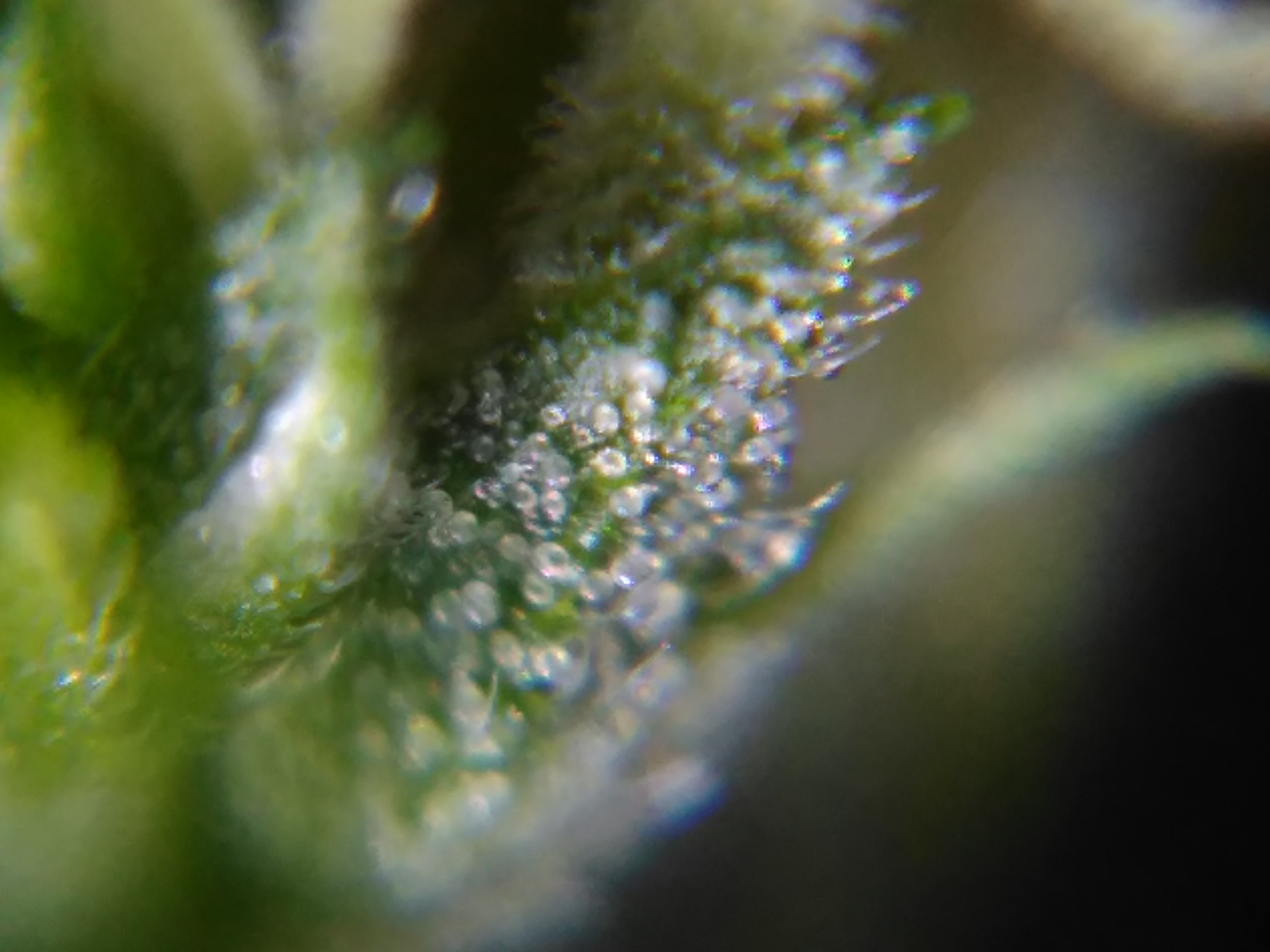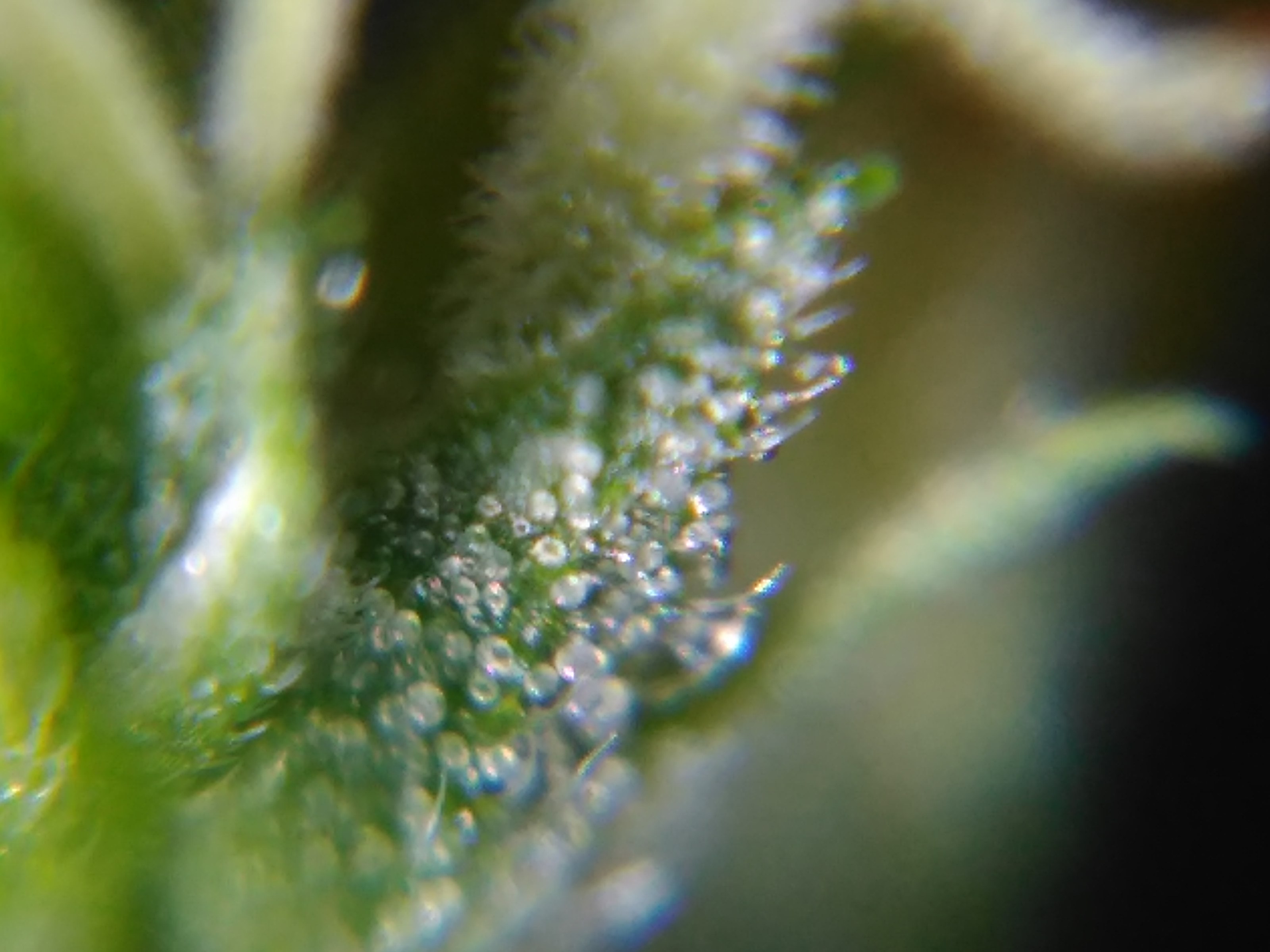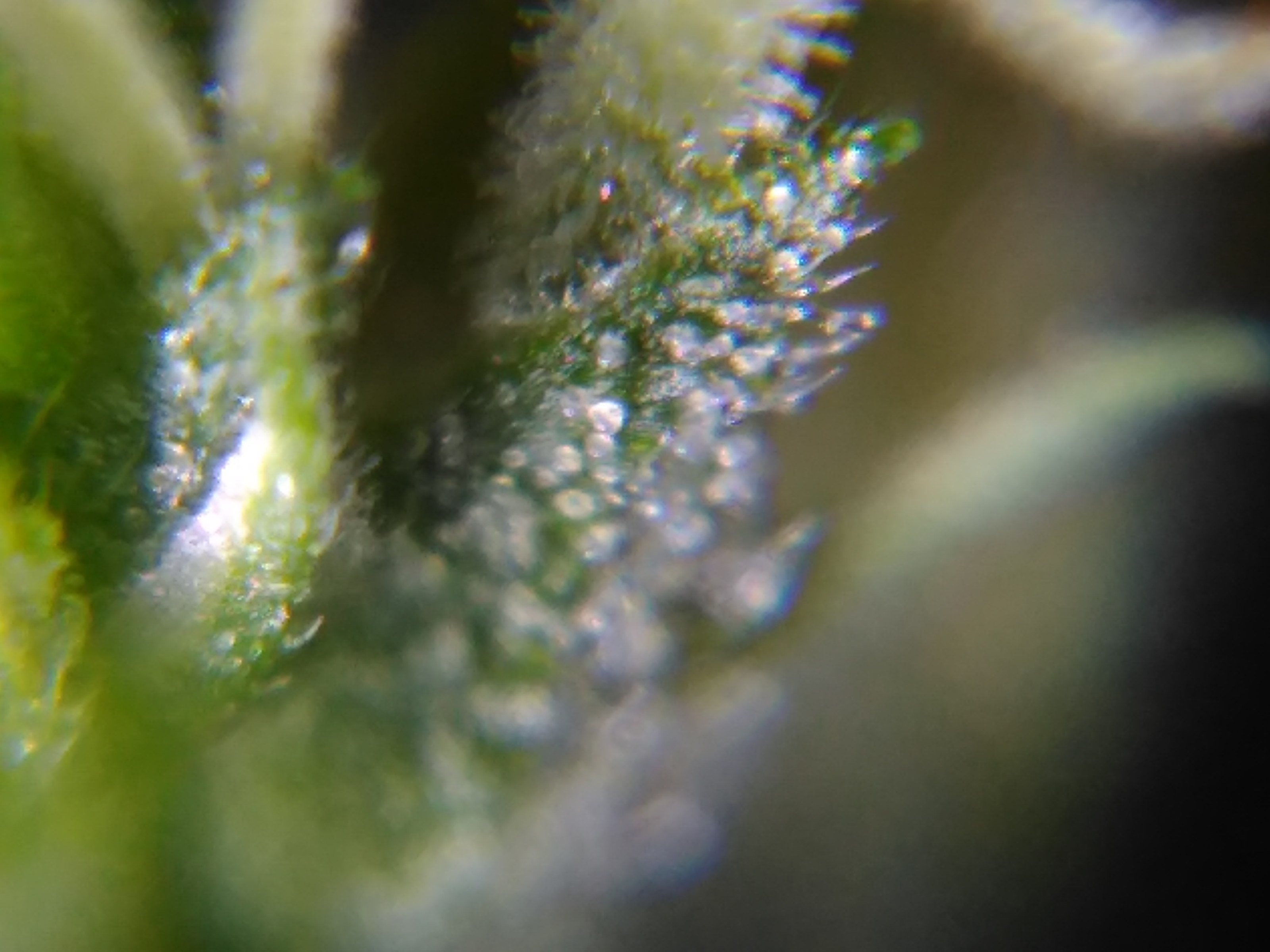 Howdy GreenArmadillo, I use a 20X lens attachment on my iPhone to photograph the tricomes. I do not use the flash (the light reflects back) and try to get some background illumination, so of to see 'through' the tricomes, this makes it easier to see their condition. I have trouble holding steady as well and usually wind up taking several photos before getting one or two usable ones.
