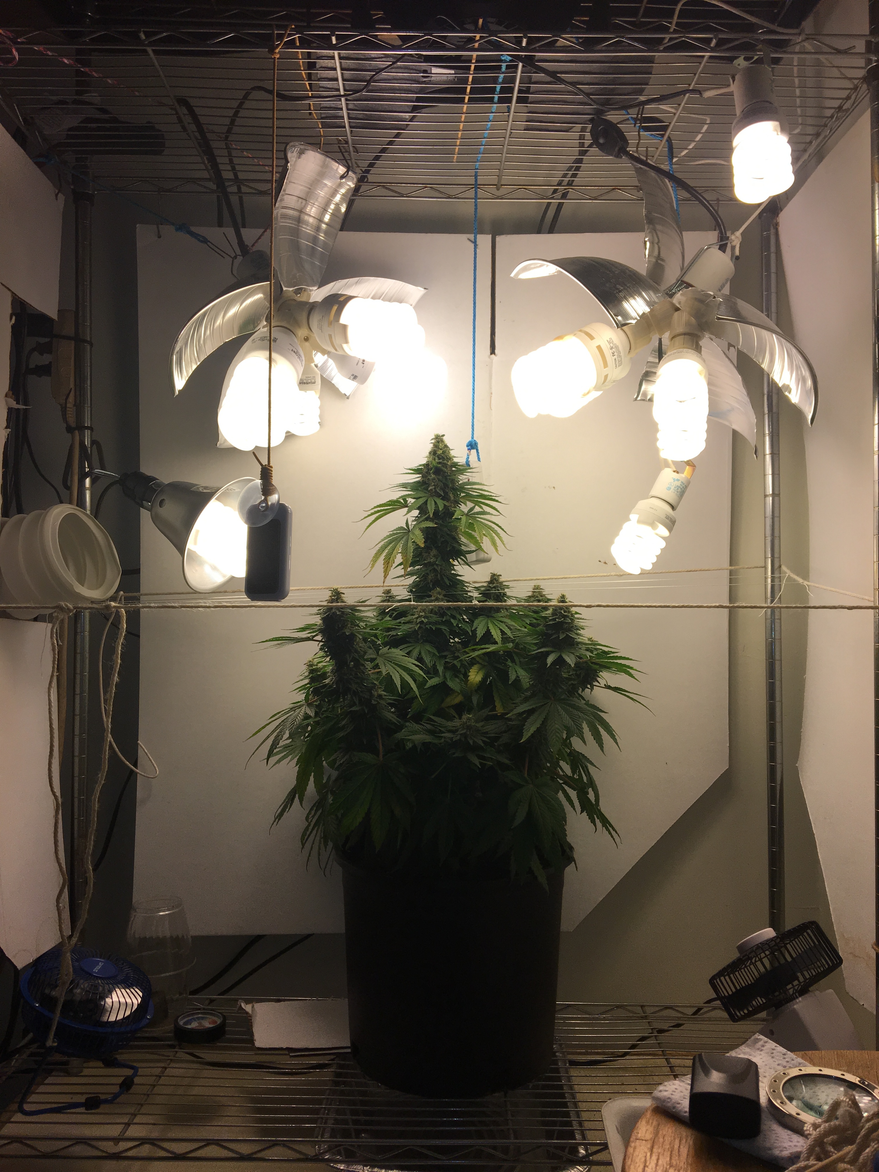 I'm running a 2x4 tent with 16-23watt CFL's and 4-T12's all 6700k for veg and will switch to 2700k's for flower with the addition of 5-40watt CFL's I have a 250cfm intake booster and a 250cfm exauhst with 3 hurricane clip fans and a couple PC cooling fans using ffof soil and advance nutrients with 5 gallon grow bags my girls are starting week 3 of veg I've supper cropped them and topped and fimmed them they are a blue cheese OG mix