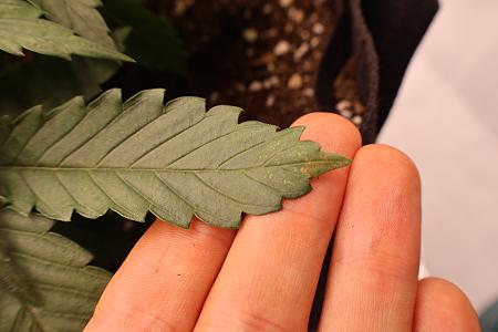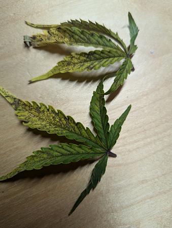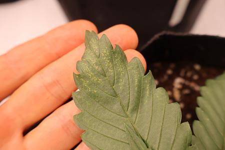 Hi. spots appear on the leaves of 2 plants(Laughing Buddha and Сritical Kush) out of 5. I noticed 5 days ago. The plants are 20 days old after planting in the soil. The spots appeared before I started giving them nuts (I use advanced nutrients pH Perfect® Grow, Micro, Bloom). I water about every 2 days with 500 ml of tap water. The Mars Hydro FC 4800-EVO LED lamp is 45 cm above the plant and works at 65%. I think it's a potassium deficiency.