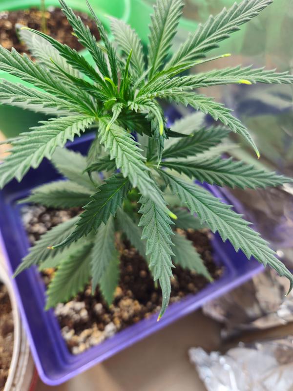 Hello fellow growers and thanks in advance for any help. This is my third grow and I have two plants in my indoor grow area; one is a banana purple punch (doing quite well, thank you) and the other is of uncertain genetics but was called Fem Autogrow Hi-C on the card I was gifted. The latter is the problem girl.