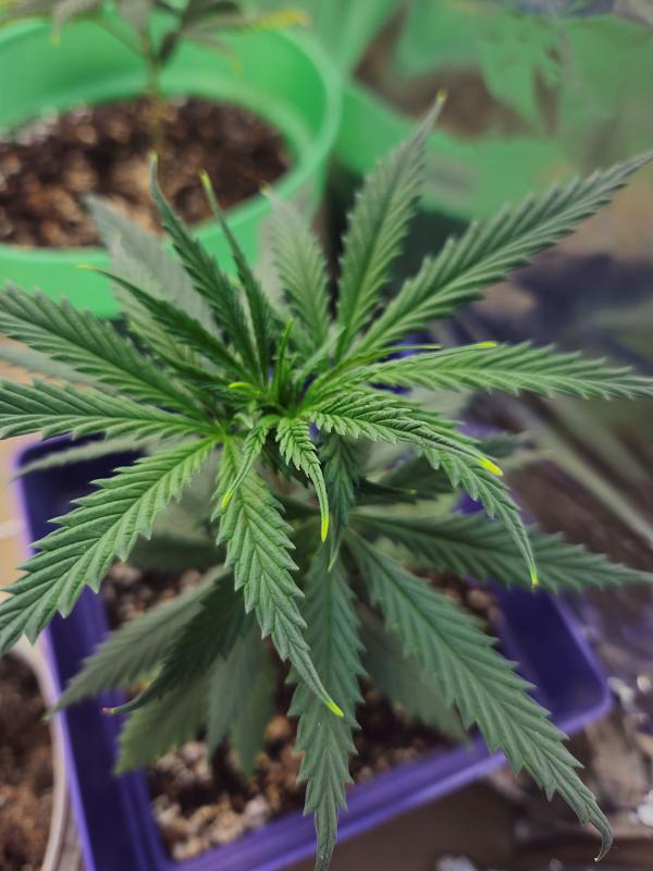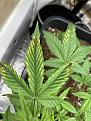 My plant is showing some nutrient deficiency. For background info: around two weeks old auto flowers, first week of using nutrients for the bigger plant, just used plain tap water on the other one, he seems te be a lot behind ( my guess is that the soil I mixed added a little bit of bat guanno, maybe it didn’t spread everywhere evenly and more came to this plant which let it to have a nute burn so now just hoping he recovers from it and transplanted in a bigger soil without any added fertilizers so well see how that goes). My bigger plant gave him canna start (3ml/L) , canna Vega (1ml/L) and canna rhizotonic (2ml/L). To lower the pH I tried using lemon to about pH 7 now ( which is really weird cause when I first added the lemon juice pH was about 6.0) soil is canna professional with a little bit of perlite added, temperatures and humidity are on point between 23C and 27C and humidity between 60% and 80%. Any suggestions of what I need to change is greatly appreciated