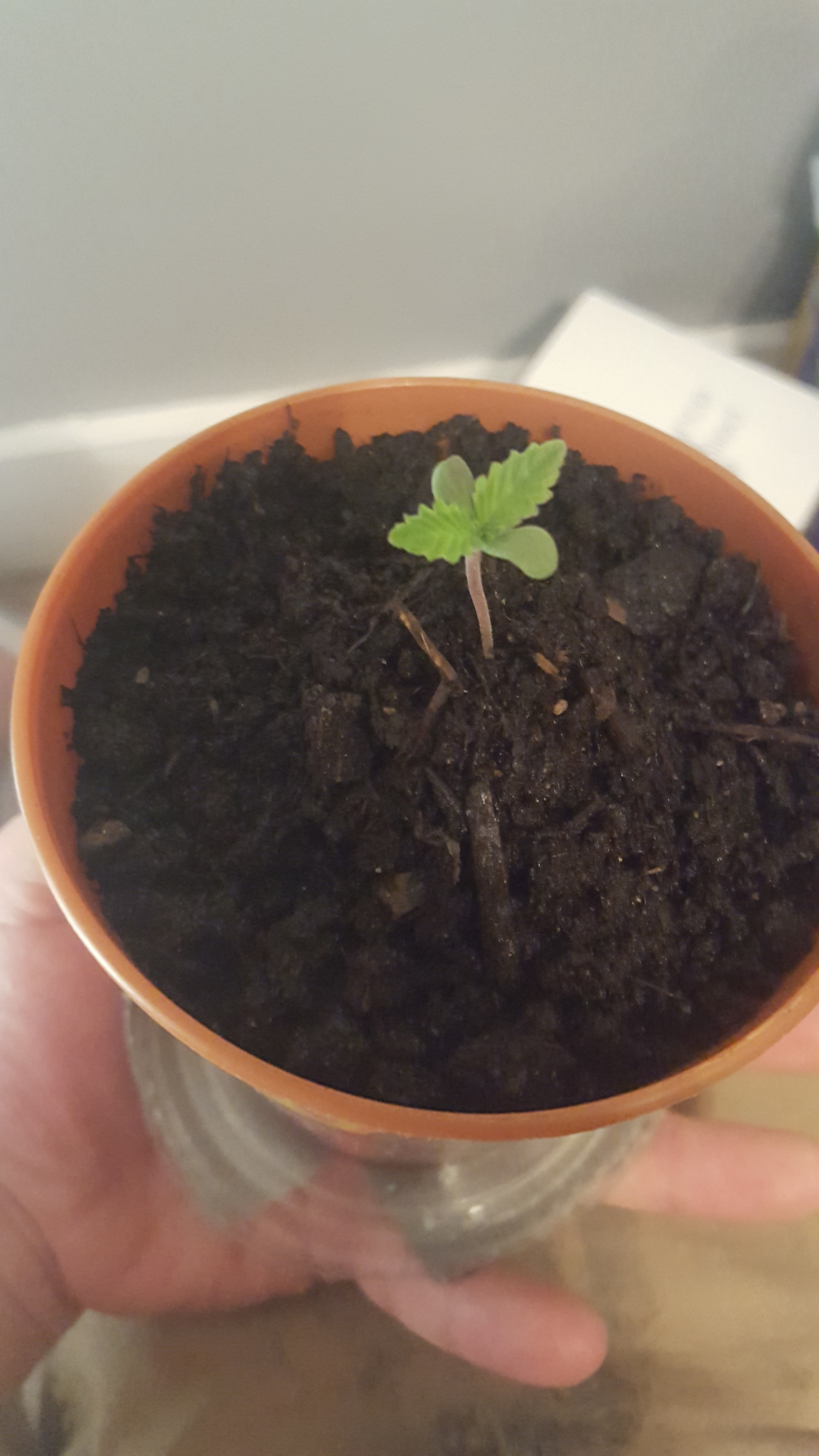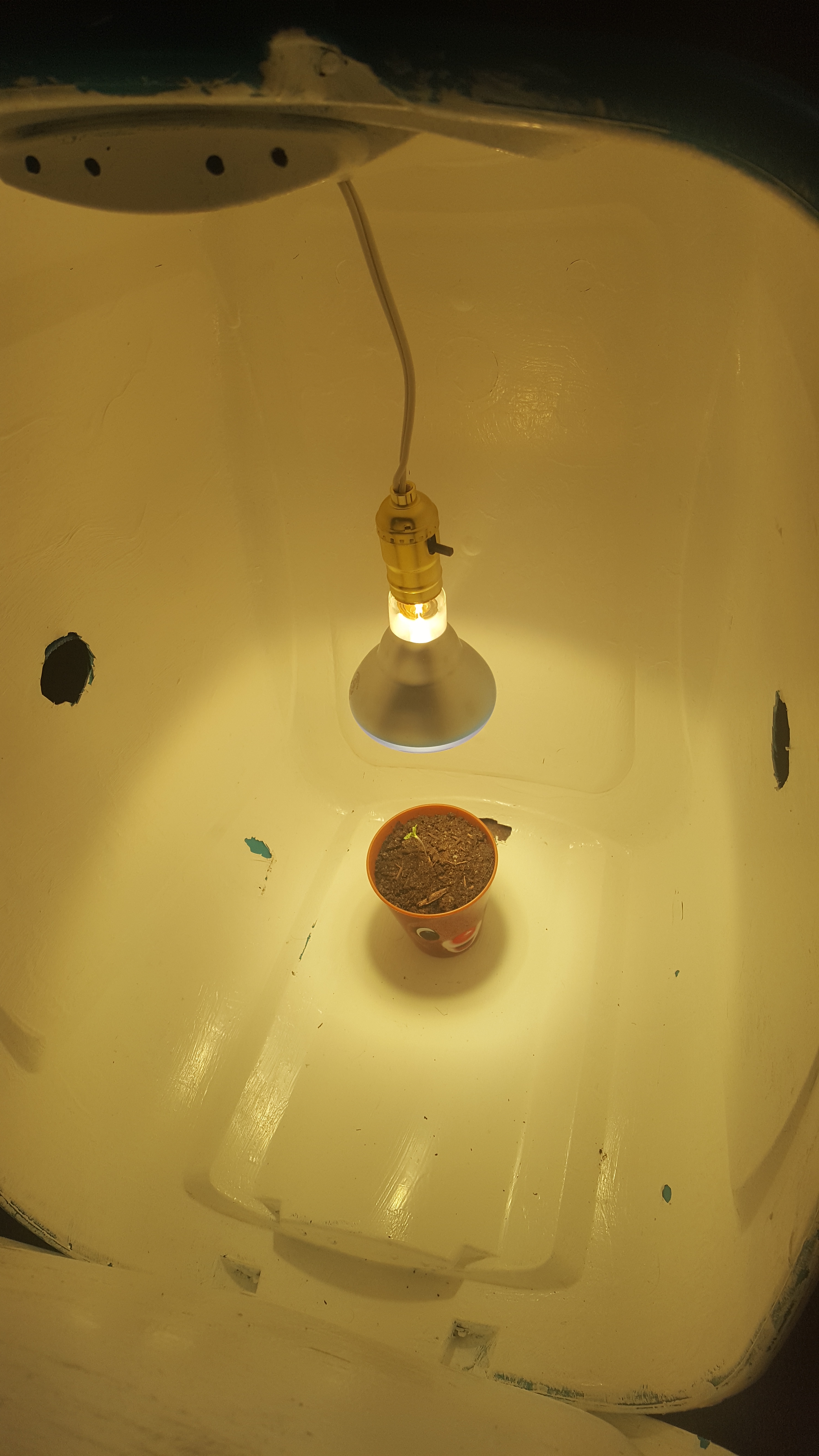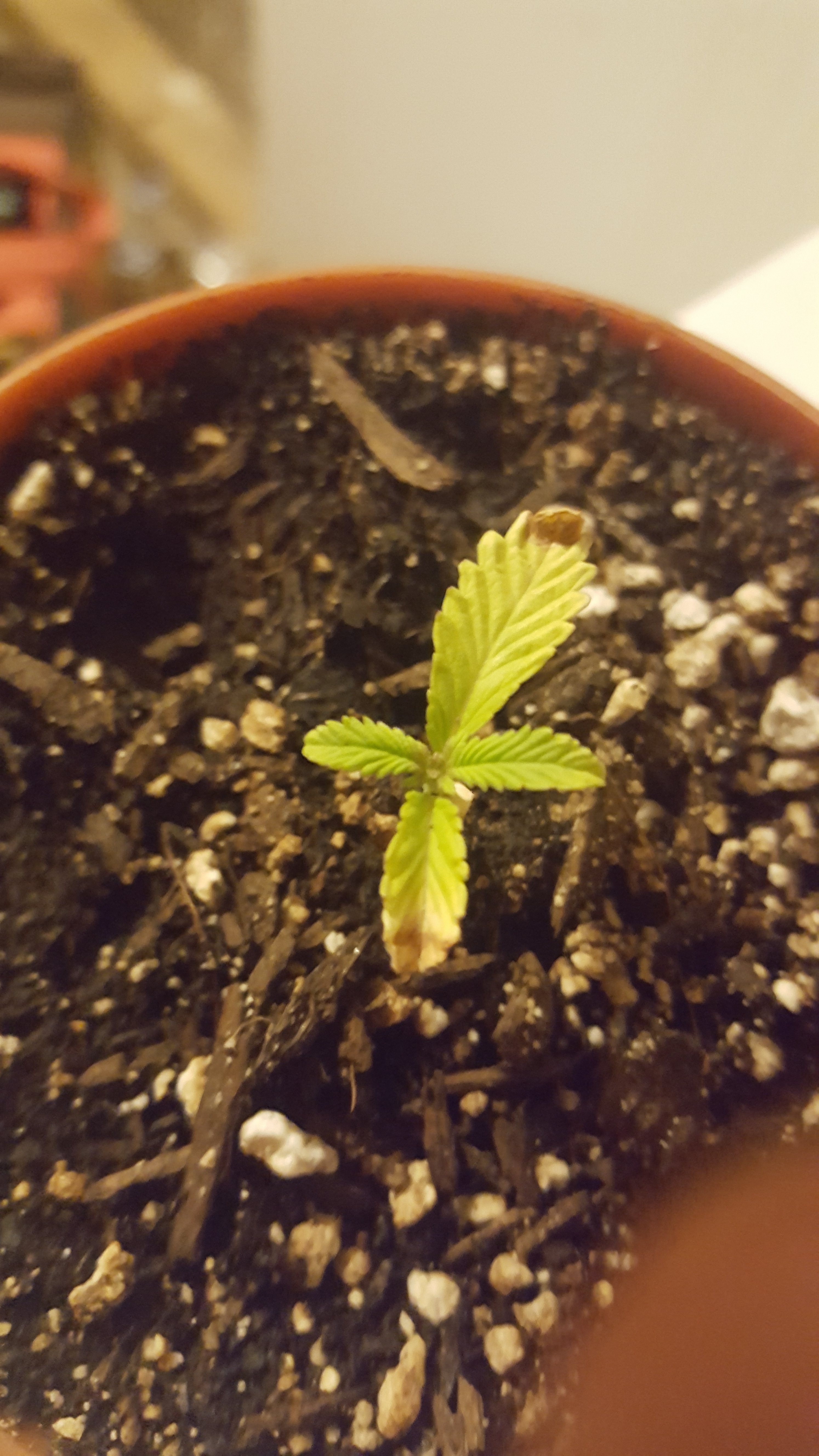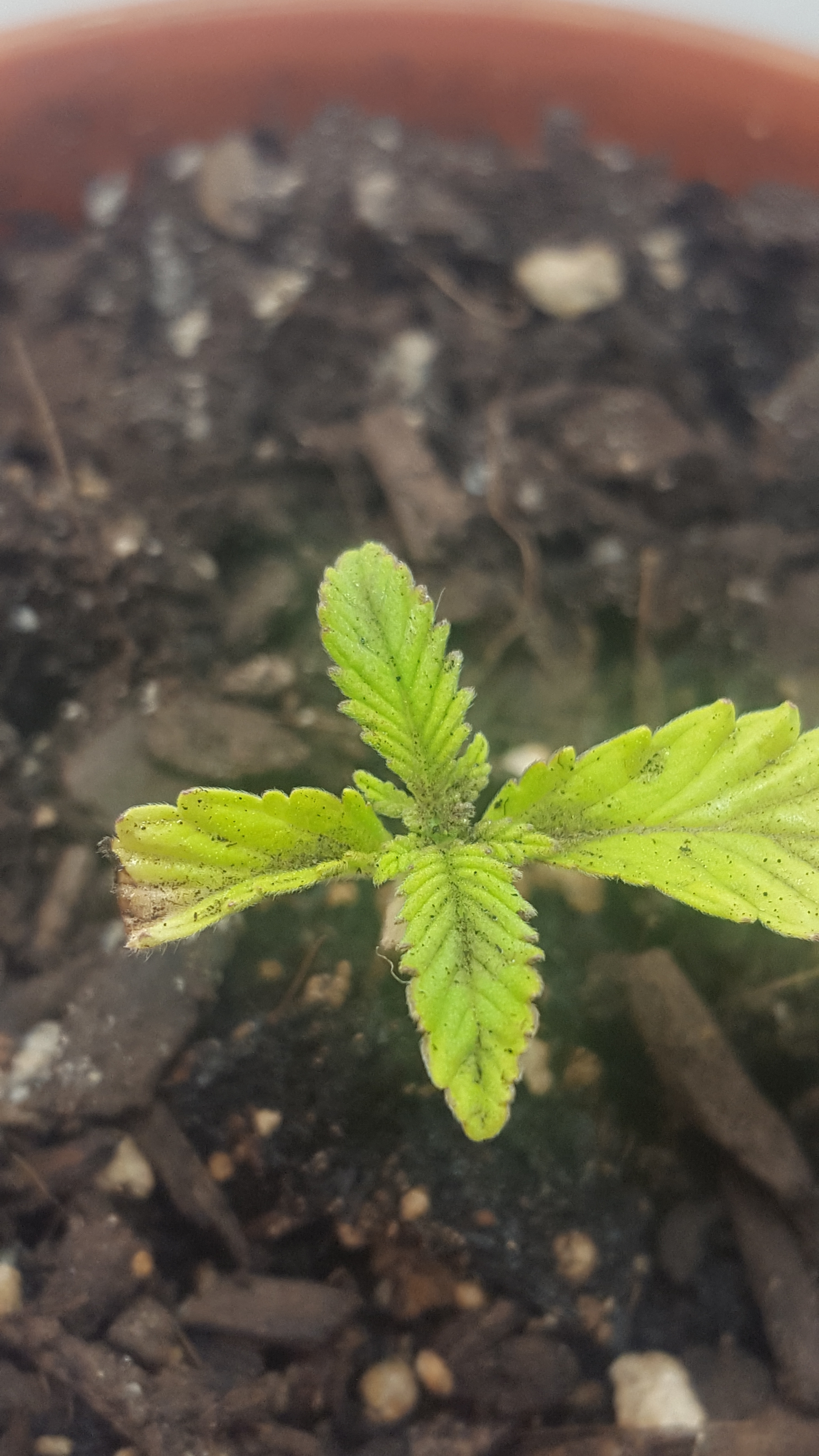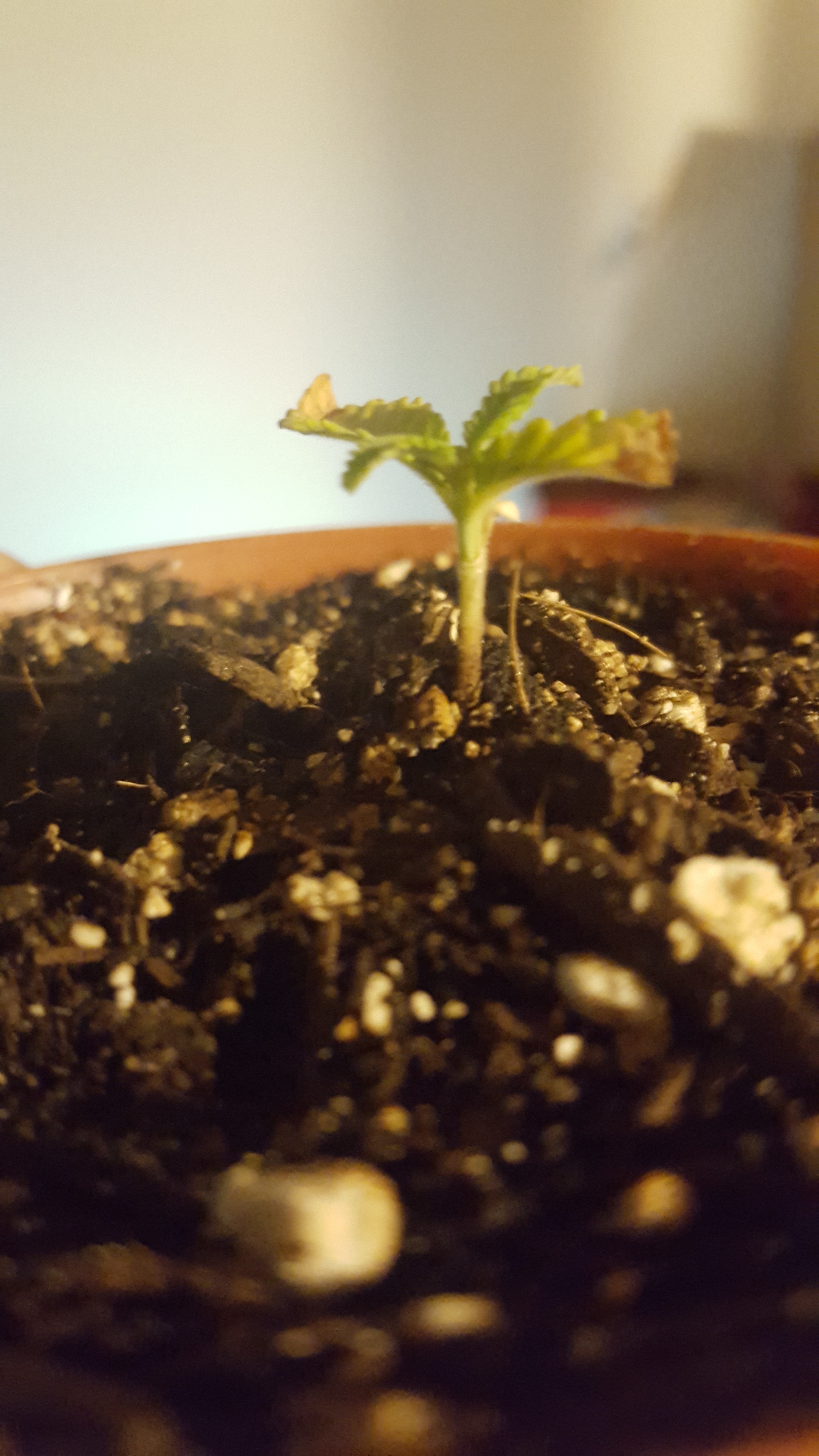 Hey guys so i started this grow journal a bit late, early on in her development i had a bit of a scare and thought she was a gonner. What i thought was originally a nute burn i now believe was a case of almost drowning. She is now 3 weeks into growth and extremely stunted. She is however starting to show improvement since pulling through. I have her in my personal diy grow box made out of an old tote, which has an intake hole and exhaust fan. Her growth medium is currently 1/3 organic ecoscrap soil, 1/3 perlite, and 1/3 worm castings, in addition to an inch of perlite at the bottom for drainage. Currently she is under a 6500k cfl for seedling growth, and i plan on adding more as she gets bigger. Also for my next watering i have a casting tea that has been steeping for three days, fingers crossed it will help perk her up and promote some nice growth. Pictures of her are from oldest to newest btw.