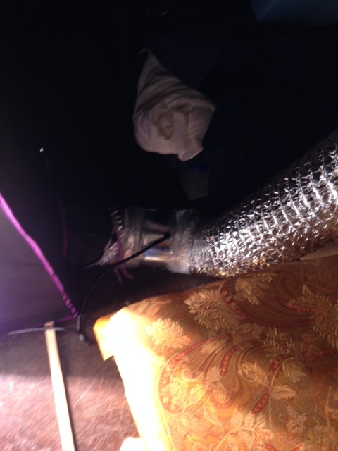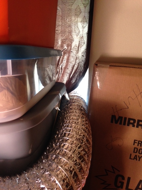 Current ventilation set up: outside air in right bottom sock from window, Tent exhaust air out left roof sock and out the door.