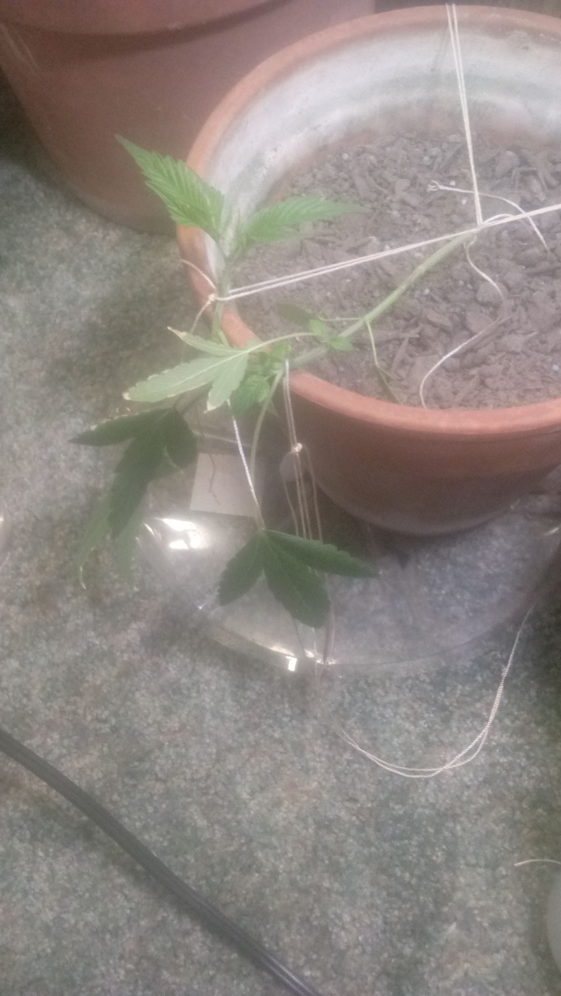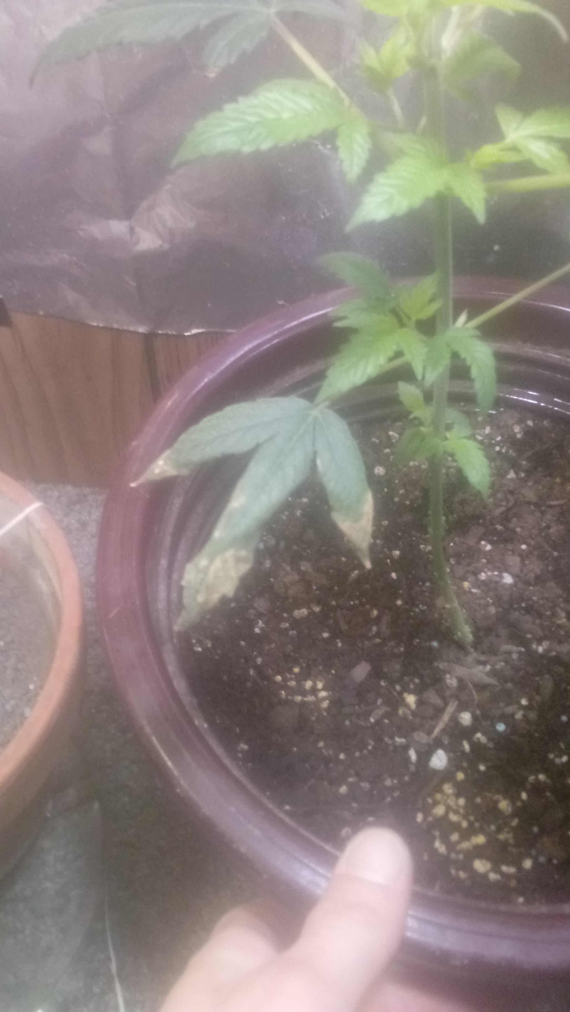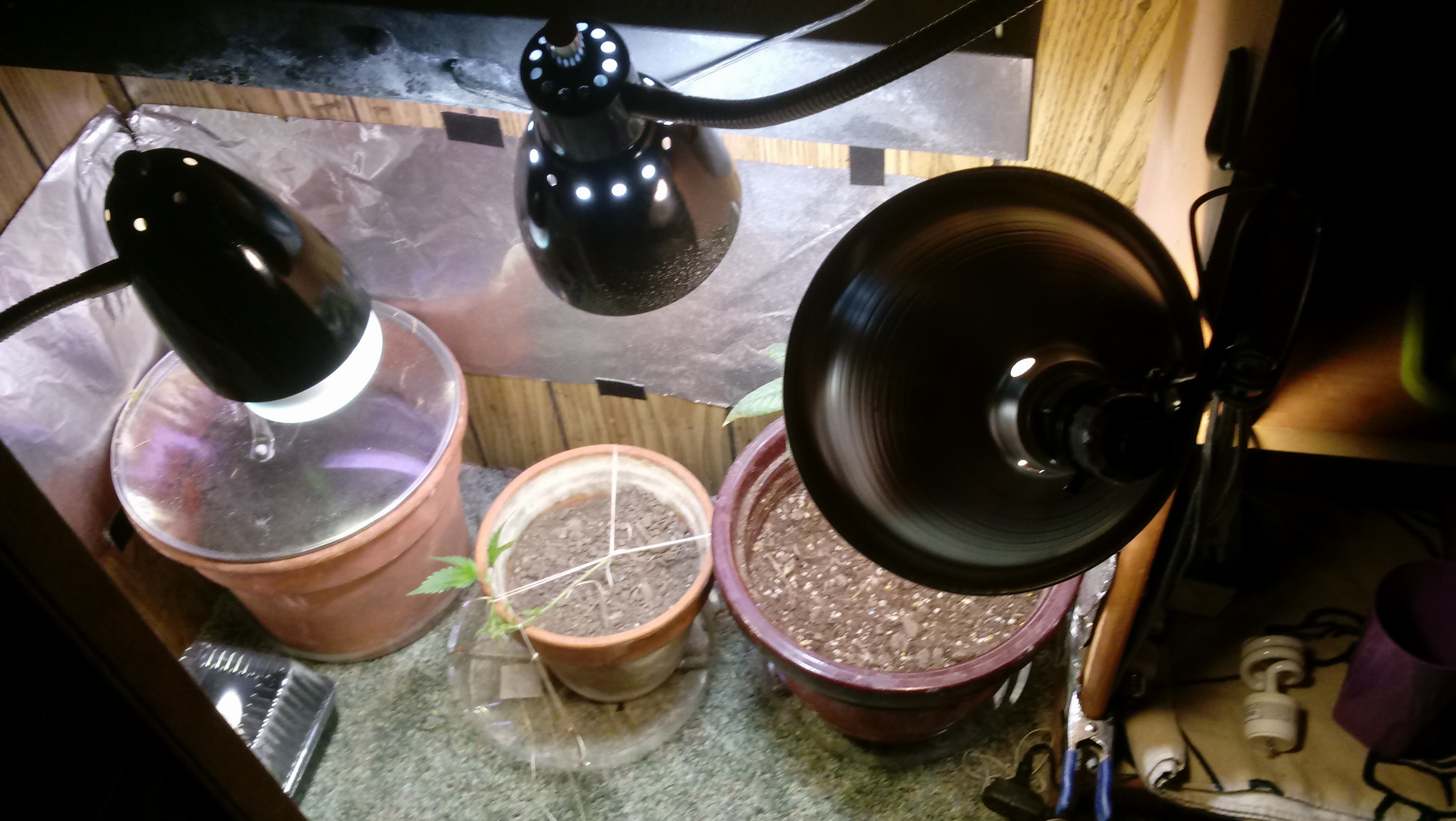 So for the first couple weeks before transplant plant 2 and 3 were getting kinda tall and plant 4 was showing little sign of wanting to grow (cant remember when plant 1 died). Well when i transplanted the something told me to put plant 4 in the container with the mixed looser soil. And after transplant plant 4 shot up and plant 2 died. Oh ya plant 2 and 4 had stem rot at transplant. I just topped plant 4 and done some trimming and did some lst on plant 3 and am trying to clone plant 4 to switch to a soilless set up after 1st harvest. Assuming she turns up female. Well back to my problem. Plant 3 is still rather small, hasnt grown much since transplant and shes almost 3 months. Both plants having issues that seem like nitrogen deficiency and have been for about a week or two now but in all reality they should be getting to much. Im also using led lights one is daylight 1550 lumens and one was somewhere between soft white and daylight at 800 lumes but also just got a 65w spotgro light to add more light and heat. Only running 2 lights in a closet and appears to light it up well.